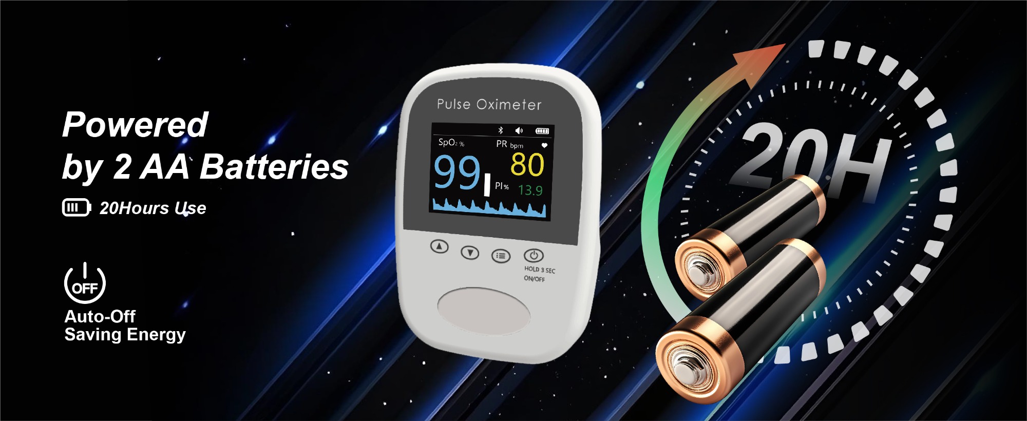The device powered by two AA batteries, can continuously operate for at least 14 hours due to its low power consumption.