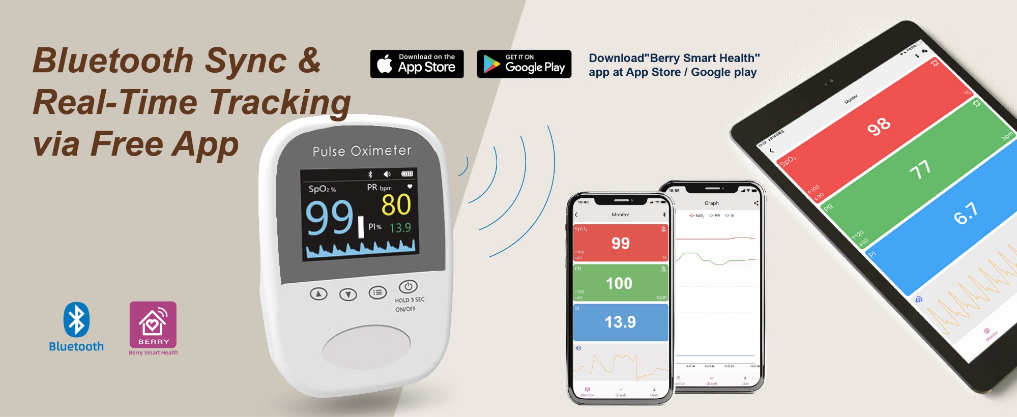 Bluetooth communication,data can be stored,Real-time data storage in app,Free APP:Berry Smart Health.